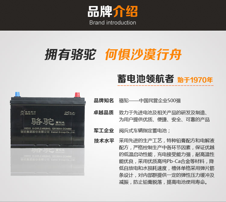 | 產(chǎn)品名稱 : | 駱駝蓄電池12V200Ah 6-QWLZ-200發(fā)電機(jī)電瓶 船用鉛酸蓄電池 |